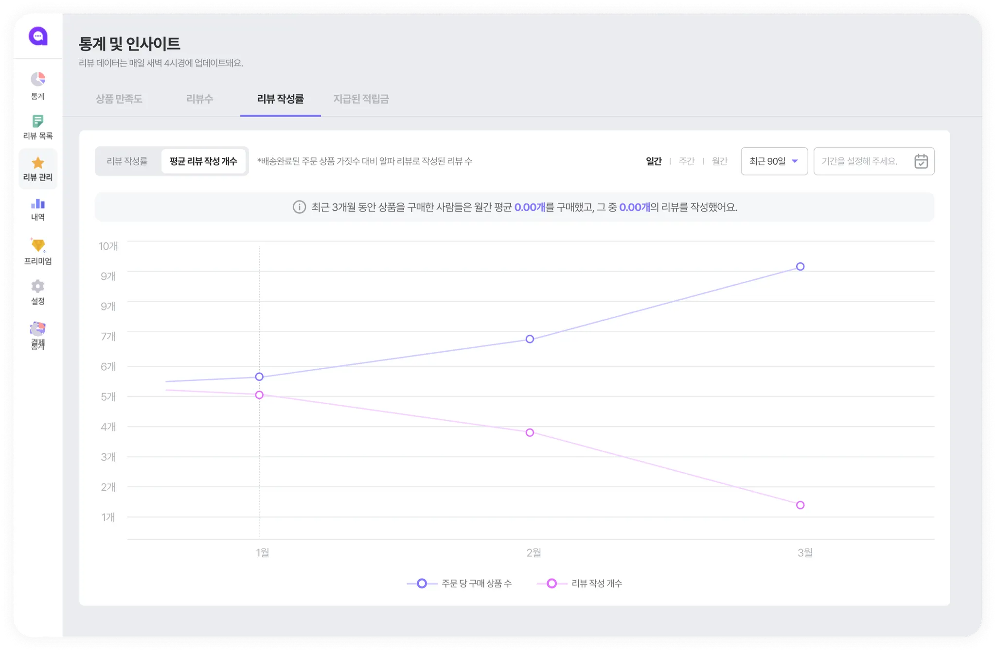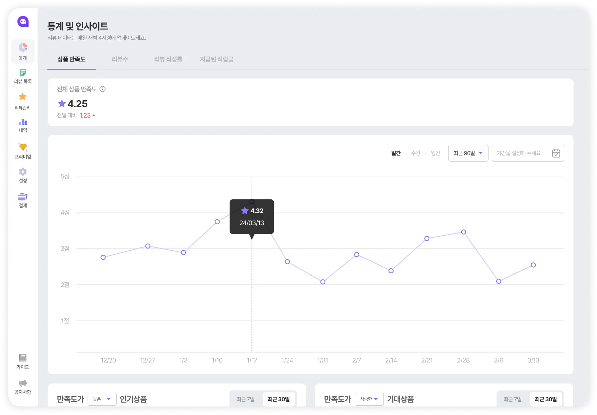 통계 페이지에 접속하면, 상품 만족도를 확인할 수 있어요. 상품 만족도는 “평균평점” 데이터예요.