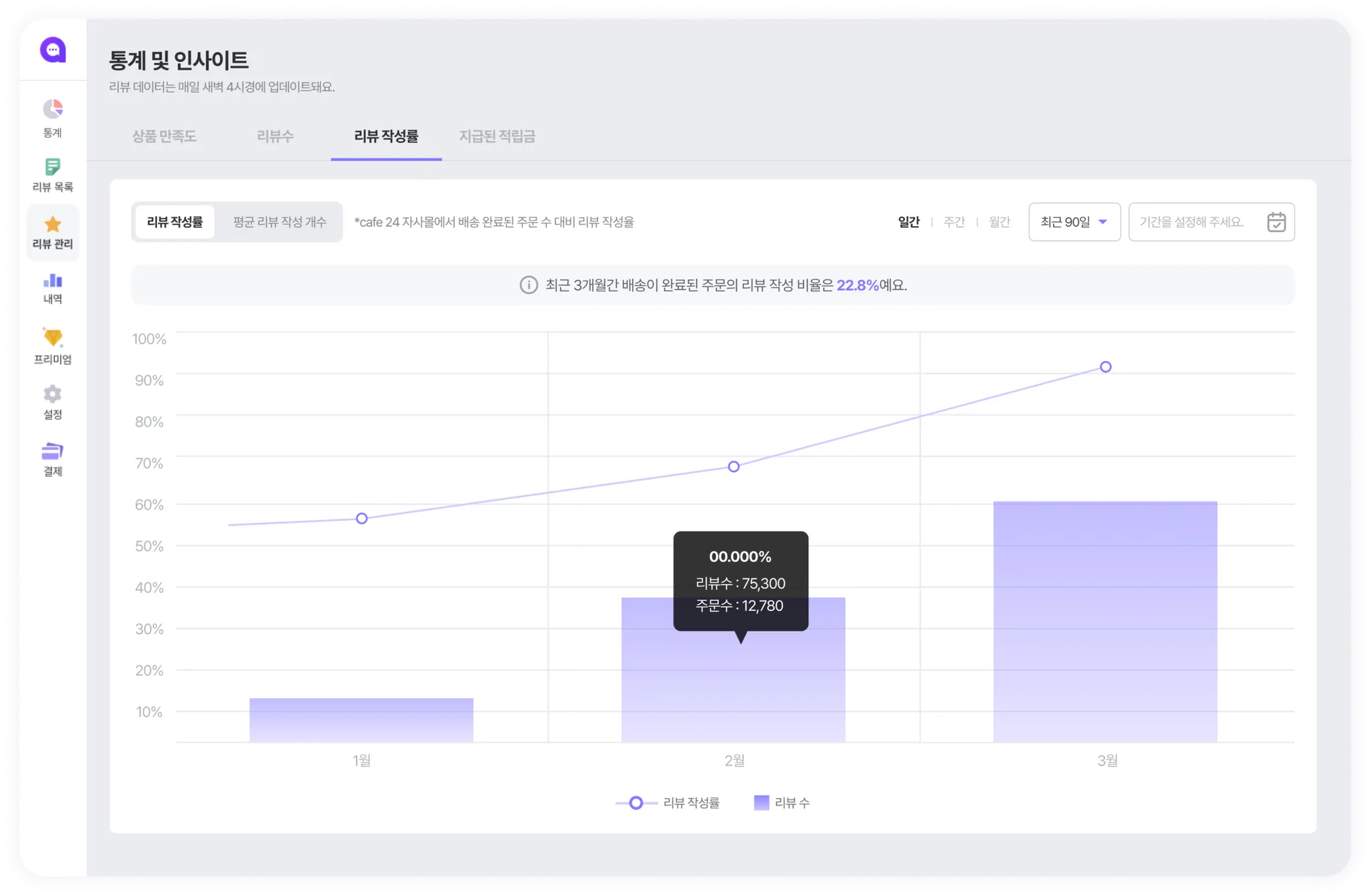 통계 & 인사이트 기능으로는 우리 사이트는 고객 신뢰를 얼마나 잘 관리하고 있는지, 알파리뷰를 얼마나 잘 활용하고 있는지 점검해볼 수 있어요. 이제 주기적으로 사이트 현황을 진단해, 알파리뷰 사용효과를 높여보세요!