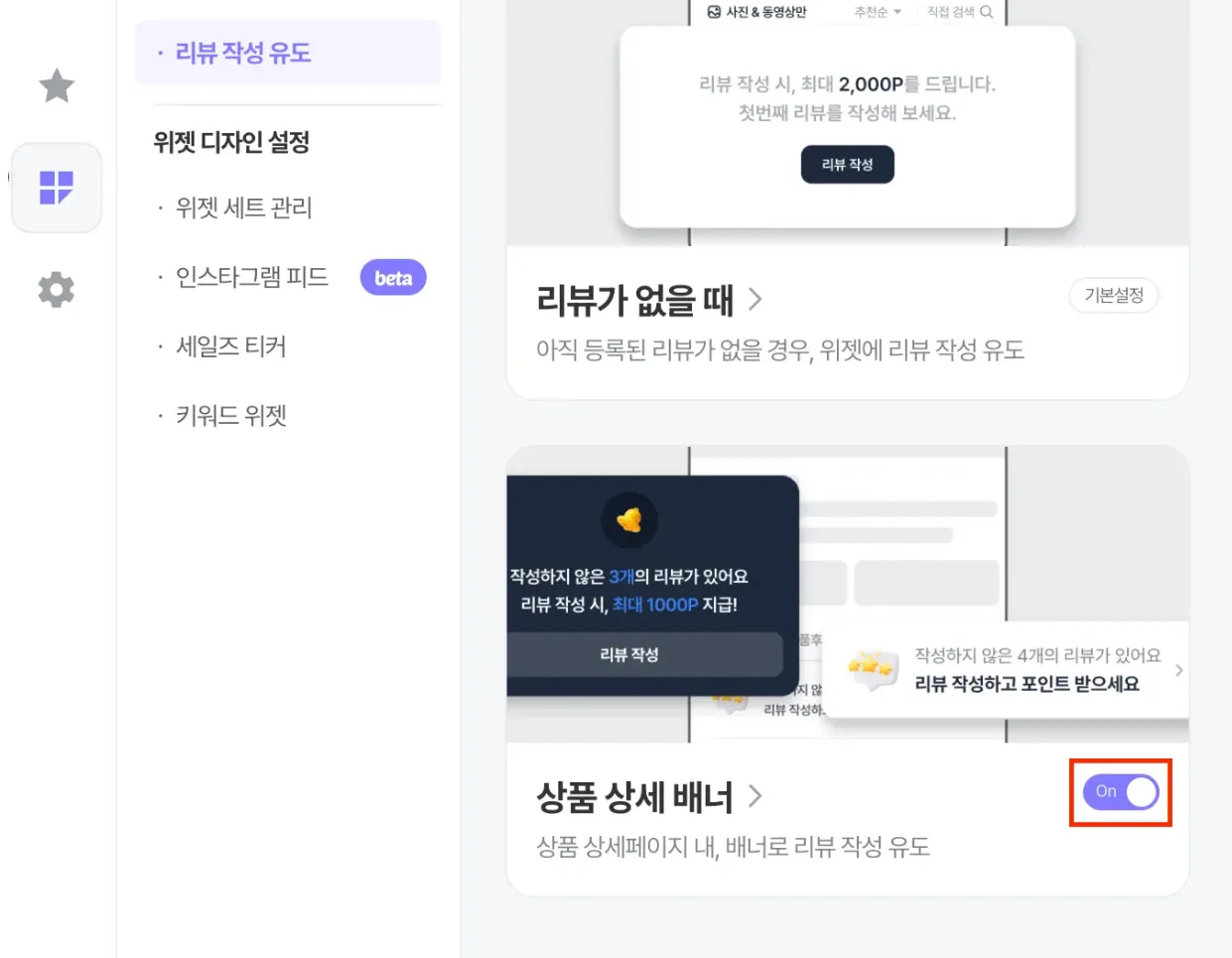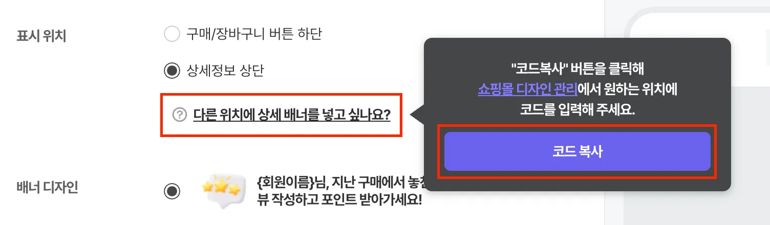 [접속 경로: 디자인 설정 > 리뷰 작성 유도 > 상품 상세 배너]