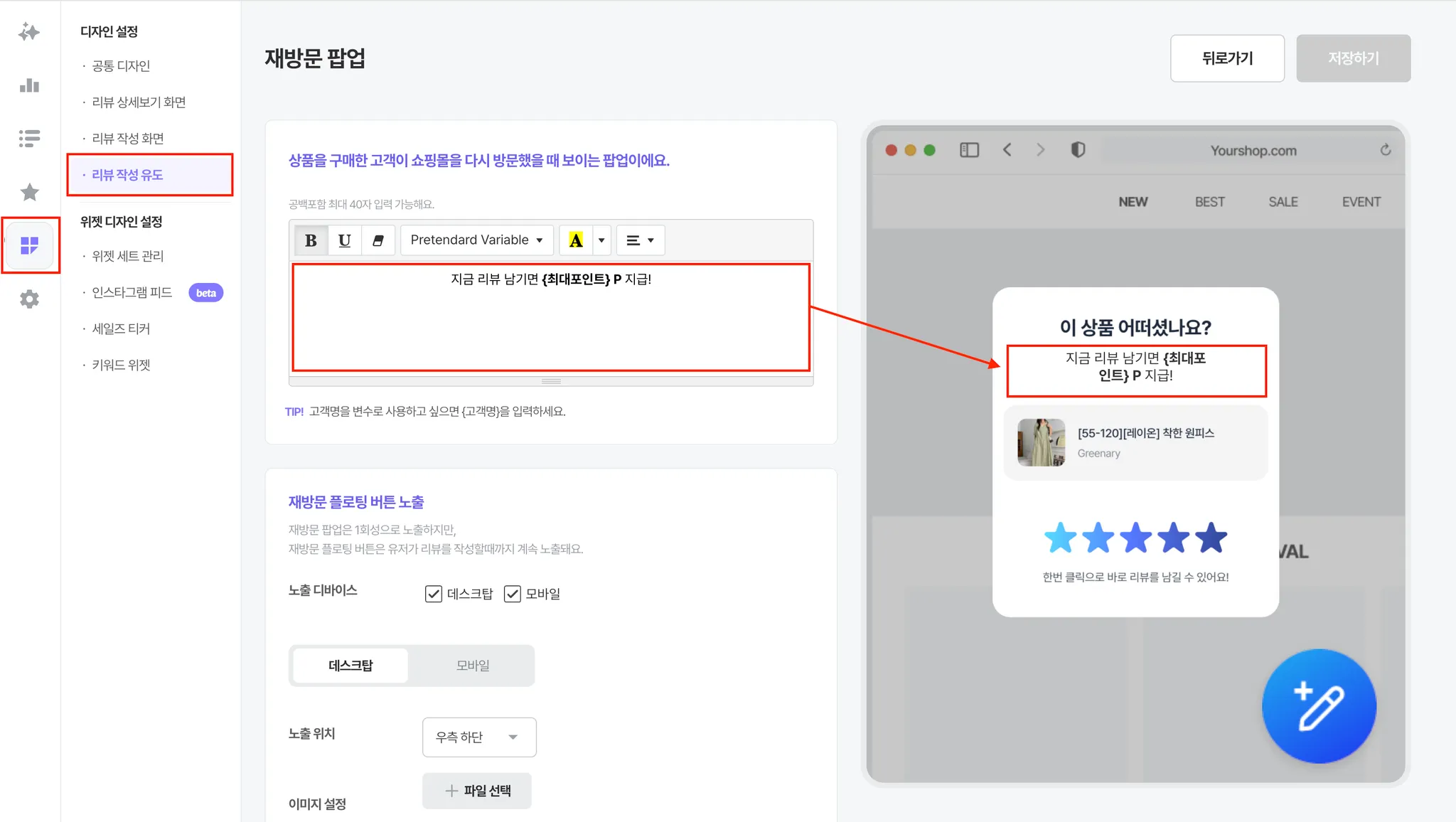 [접속 경로: 디자인 설정 > 리뷰 작성 유도 > 재방문 팝업]