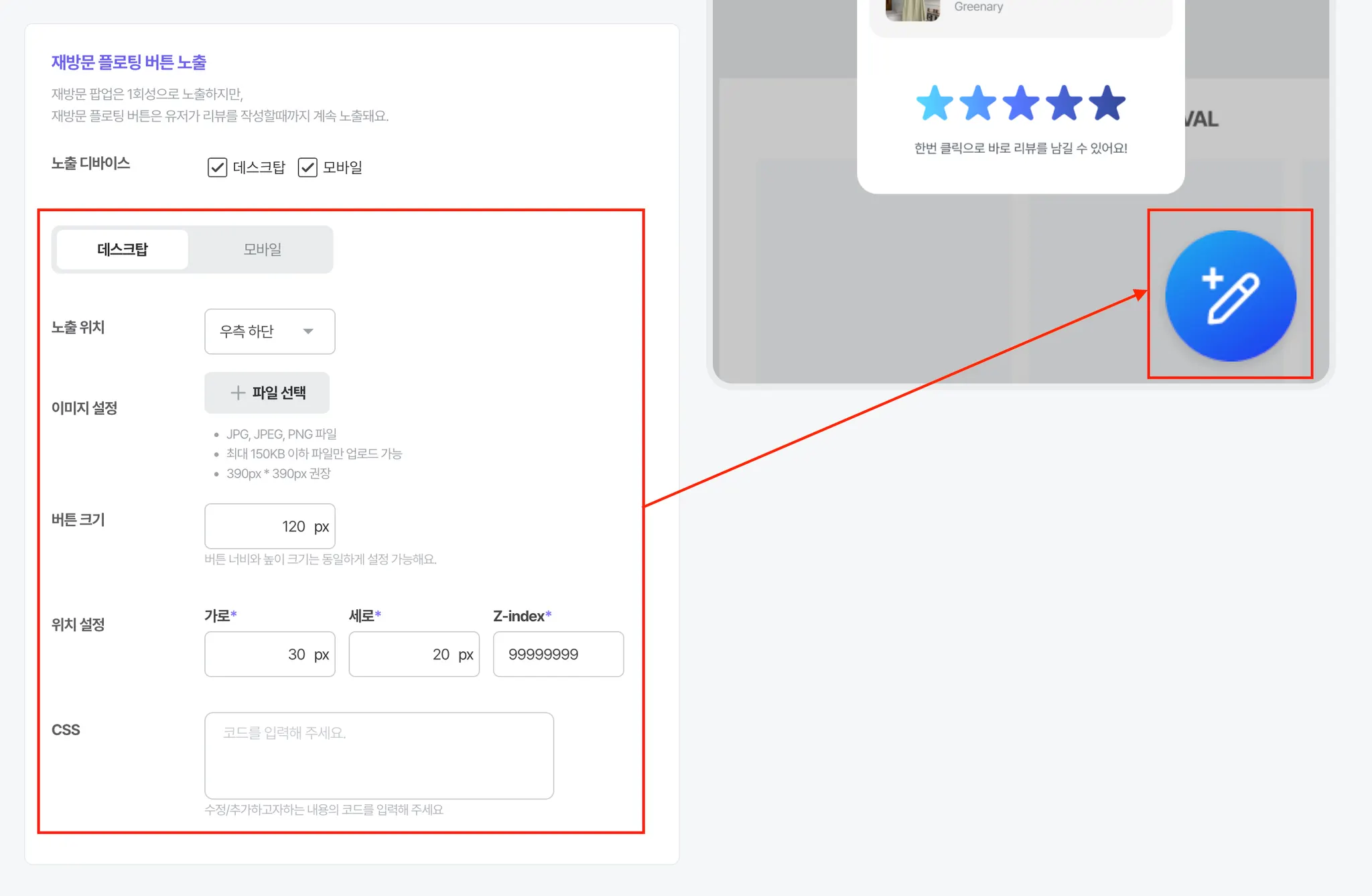 쇼핑몰 접속 시 왼쪽 이미지와 같이 리뷰를 작성하도록 유도하는 재방문 팝업과 플로팅 버튼이 노출됩니다