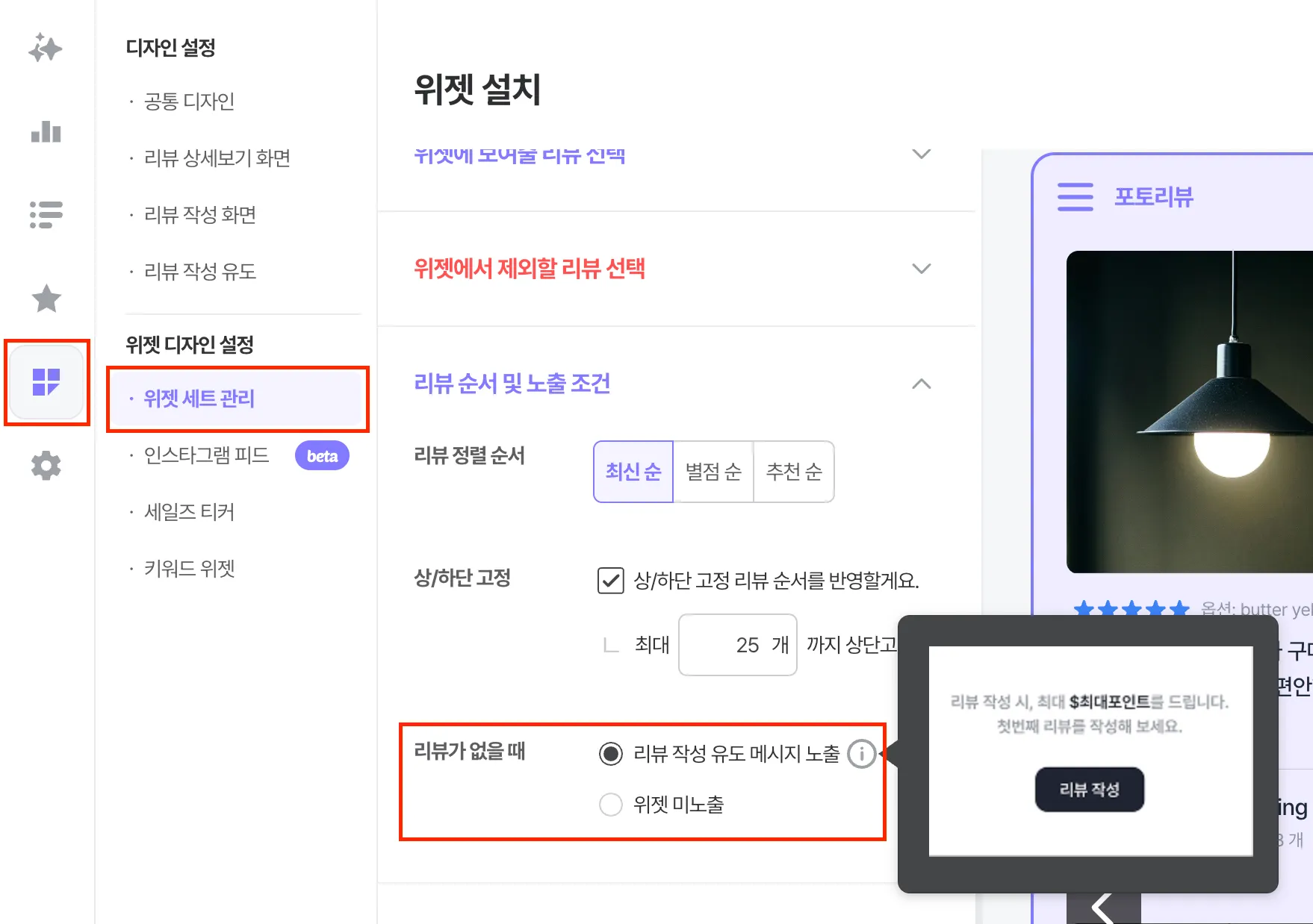리뷰 순서 및 노출 조건에서 리뷰가 없을 때, 위젯 미노출으로 설정을 변경해주세요!