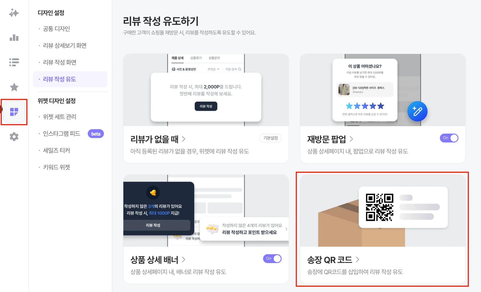 [접속 경로: 디자인 설정 > 리뷰 작성 유도 > 송장 QR 코드]