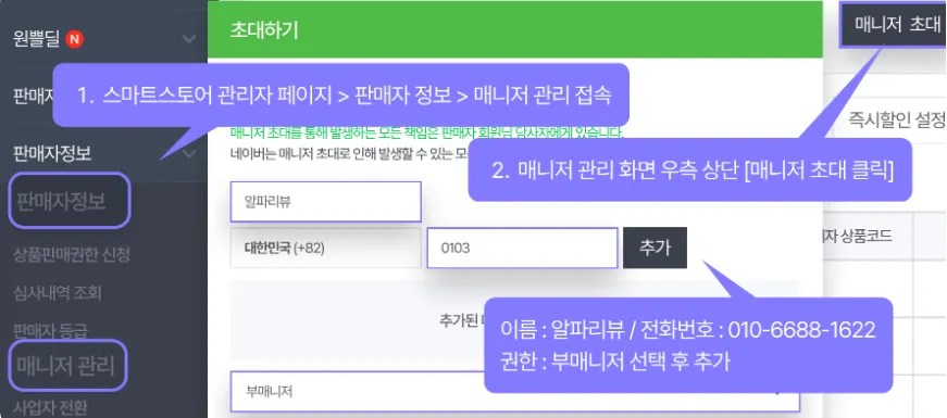 [스마트 스토어 관리자 페이지 > 판매자 정보 > 매니저 관리]