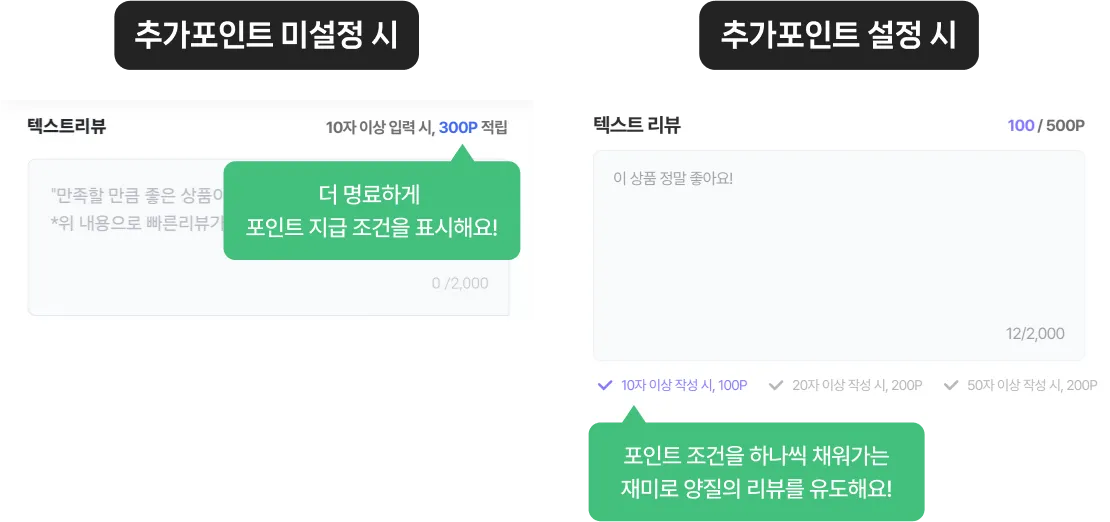 *포인트 CTA란, 리뷰 작성으로 얻을 수 있는 포인트를 안내해줌으로써 더 많은 리뷰/정성스러운 리뷰를 유도하는 기능이에요.