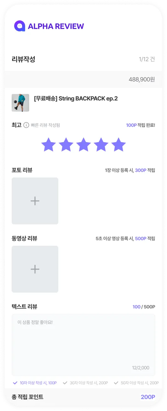알파리뷰의 작성페이지를 십분 활용하려면 이 가이드를 참고 추가포인트도 설정해보세요! (추가포인트란, 텍스트리뷰가 "장문일수록", "더 많은" 사진을 첨부할수록 더 높은 포인트를 지급하는 알파리뷰만의