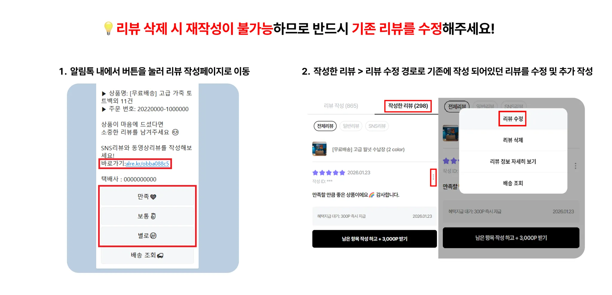 리뷰 삭제 시 재작성이 불가능하기 때문에 꼭 "리뷰 수정"기능을 이용하시도록 안내 해주세요