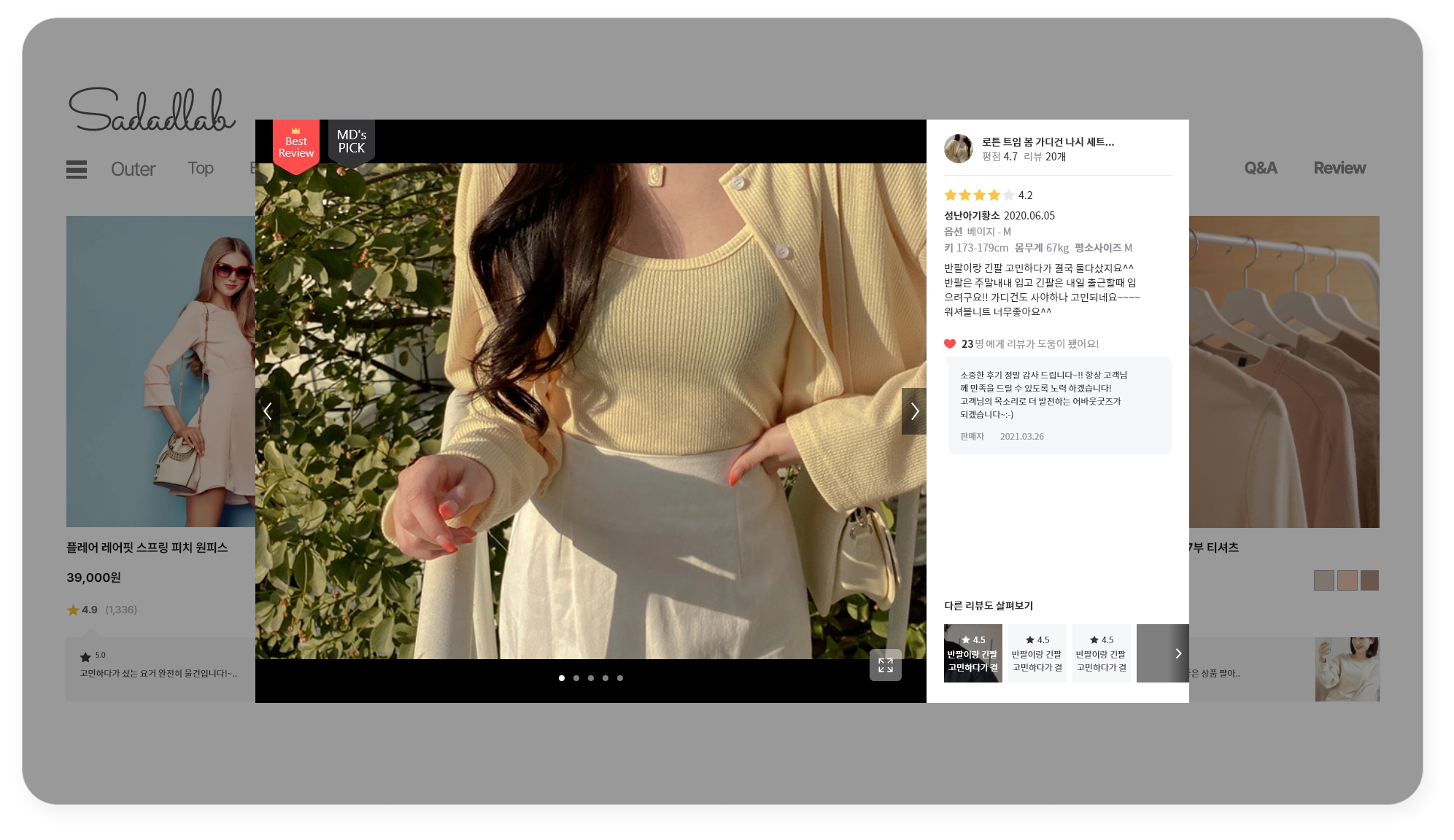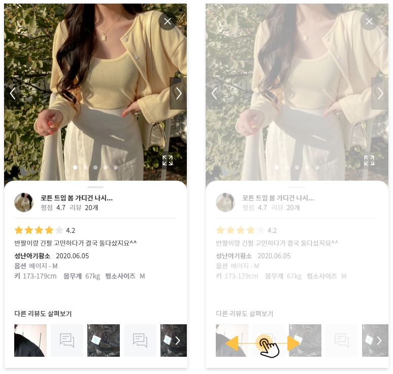 모바일에선 하단 영역, PC에서는 우측 영역에 다른 작성자의 리뷰들을 보여줘, 이제 고객들은 더 쉽게 풍부한 리뷰 정보들을 확인해 볼 수 있어요