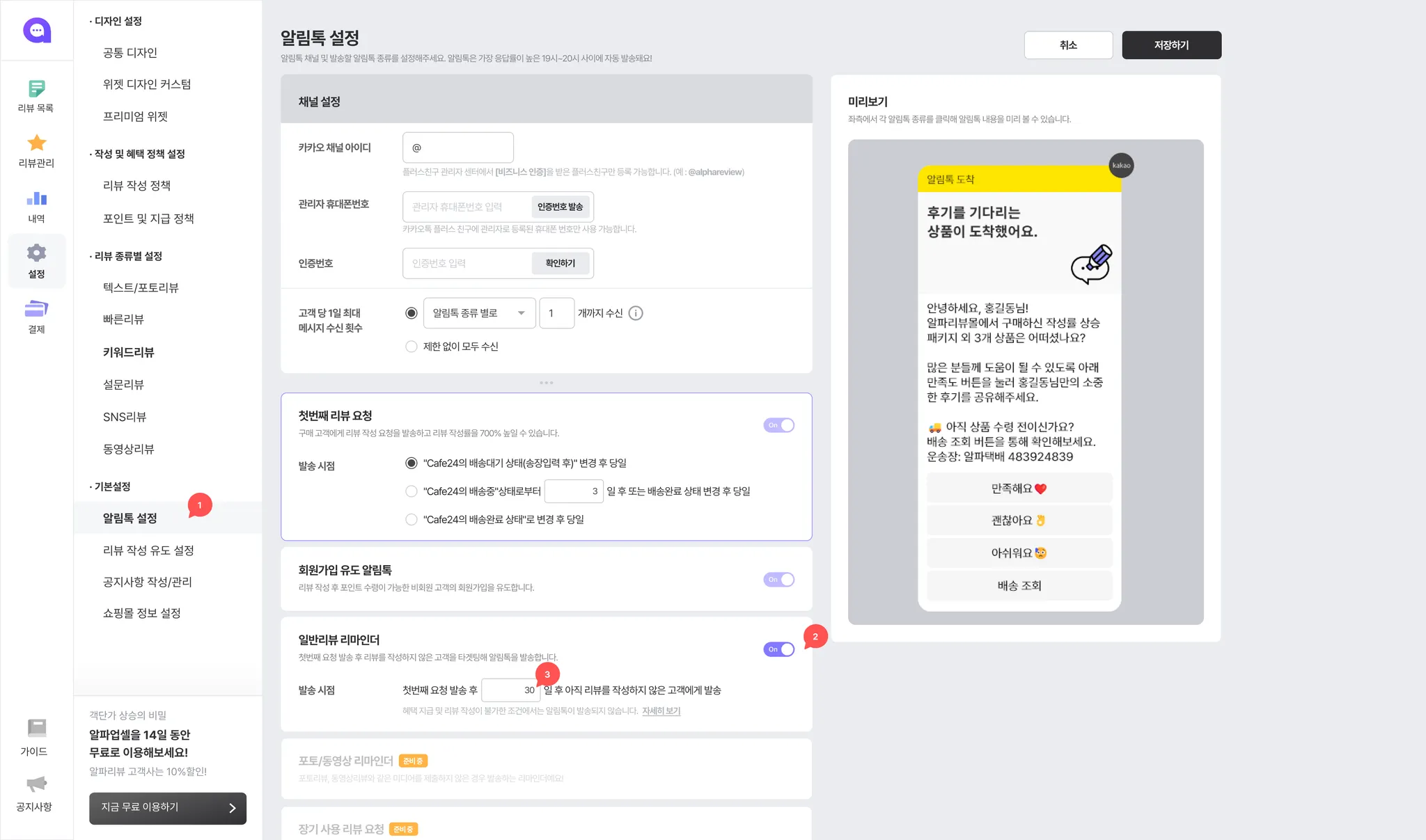 일반리뷰 리마인더 설정을 켜주세요.
