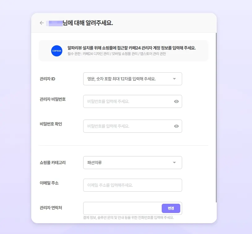 만약 알파리뷰 사용 중 담당자가 변경 되었다면 [설정 > 쇼핑몰 정보 설정]에서 새로운 정보로 갱신 부탁드립니다