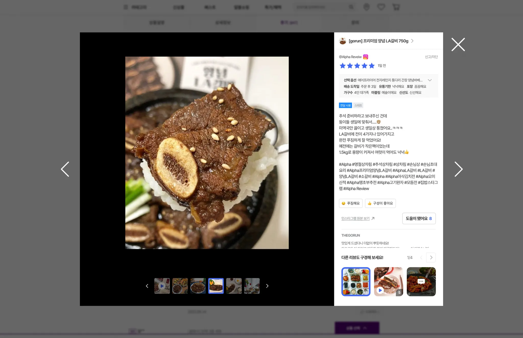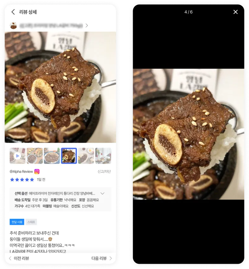 리뷰의 내용이나 사진을 더 자세히 보기 위해 클릭했을 표시되는 화면이에요. 업데이트 전 모습