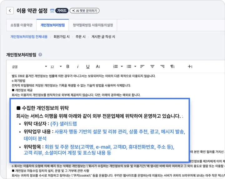 2. 개인정보처리방침을 아래와 같이 수정해 주세요.