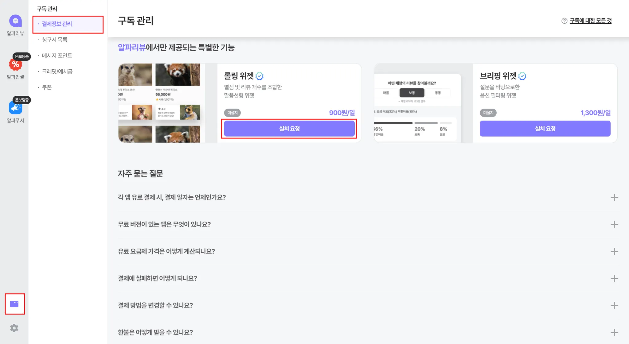 접속 경로: [구독관리 > 결제정보 관리 > 롤링 위젯 "설치 요청"]