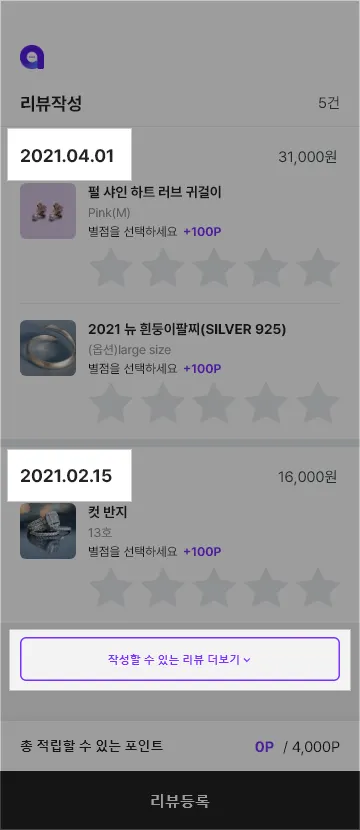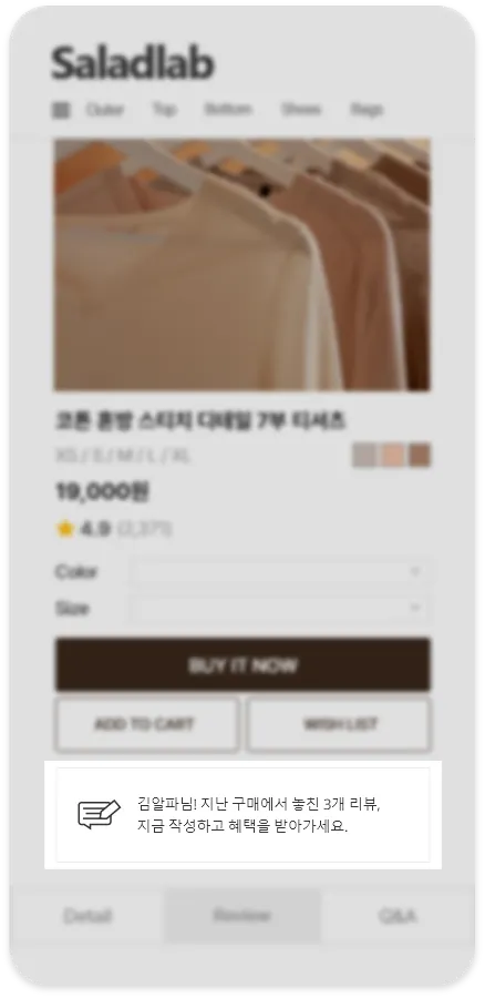 구매 이력이 있는 고객이 상품 상세페이지에 진입했을 때, 구매 버튼 근처에서 리뷰 작성을 유도합니다. 구매 의사가 있는 고객은 포인트를 필요로 하기에, 더 많은 리뷰를 작성하게 됩니다. 또한 상품 상세페이지 진입했다면, 이전 구매에서 만족한 재구매 의사가 있는 고객이라는 뜻이기에 자신의 만족 경험에 대한 리뷰를 남길 가능성이 높습니다.