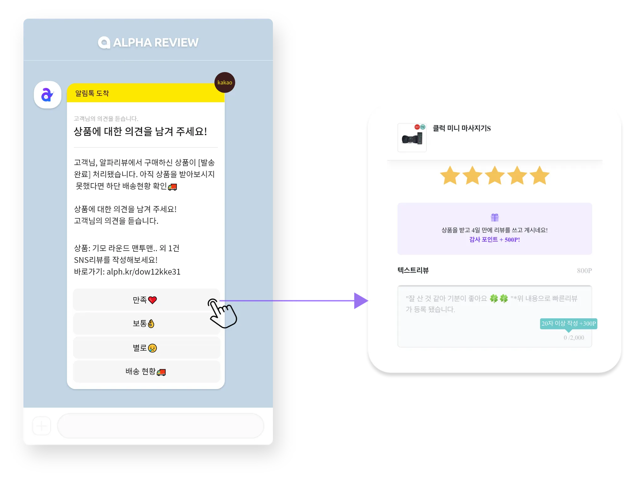 알림톡의 버튼 터치 한 번으로 리뷰 등록 완료 (알림톡의 버튼 터치 한 번으로 바로 리뷰 작성 페이지로 이동해요!