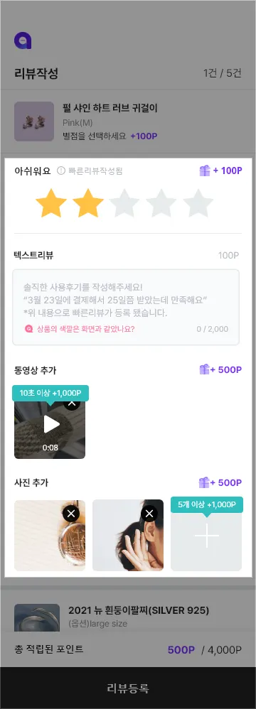 알파리뷰는 고객이 별점리뷰에서 더 나아가 포토리뷰, 동영상리뷰까지 작성하고 싶도록 만드는 포인트 인터랙션을 주고 있어요.