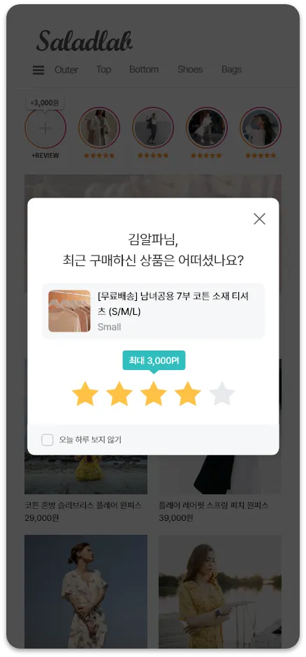 구매 이력이 있는 고객이 쇼핑몰에 재방문했을 때, 구매한 상품에 대해 다시 한 번 리뷰 작성을 유도합니다. 고객에게 말을 걸듯이 상품에 대한 후기를 물어, 자연스럽게 리뷰 작성을 유도할 수 있어요! 뿐만 아니라, 리뷰 작성을 마무리하지 않은 채 재방문배너를 종료했다면 플로팅을 표시해 리뷰 작성을 유도합니다.