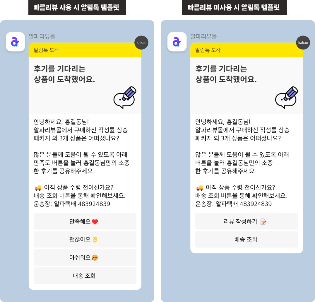 알림톡을 받아보시는 고객 분들의 고객 경험을 증진시키고 쇼핑몰의 리뷰 작성률을 높이기 위해, 중요도가 낮은 내용(주문 번호, SNS리뷰 작성 유도 등)은 과감히 빼고, 리뷰 작성을 유도하는 문구 위주로 내용이 수정 되었습니다!